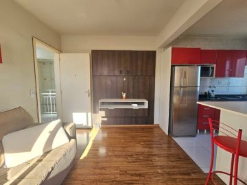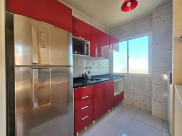 * CONFORTO GARANTIDO: Mobiliado com móveis planejados modernos (cozinha vermelha em MDF com granito, armários no quarto e painel de TV) e eletrodomésticos essenciais (cooktop, geladeira inox, micro-ondas e até máquina de lavar/centrífuga!).