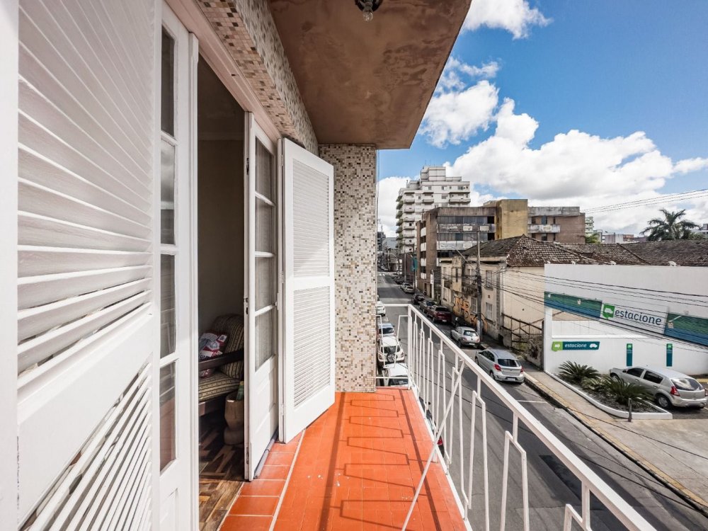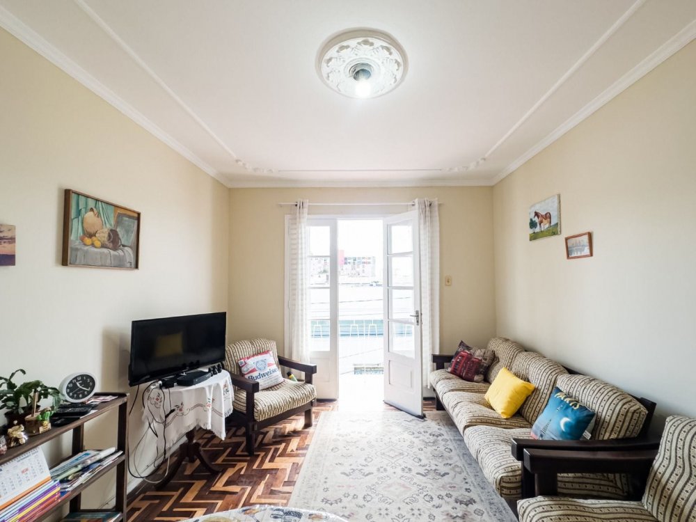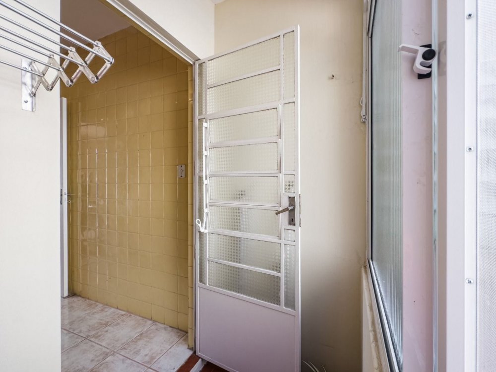 Apartamento central com 2 dormitórios, sala de estar, cozinha, wc auxiliar e área de serviço.